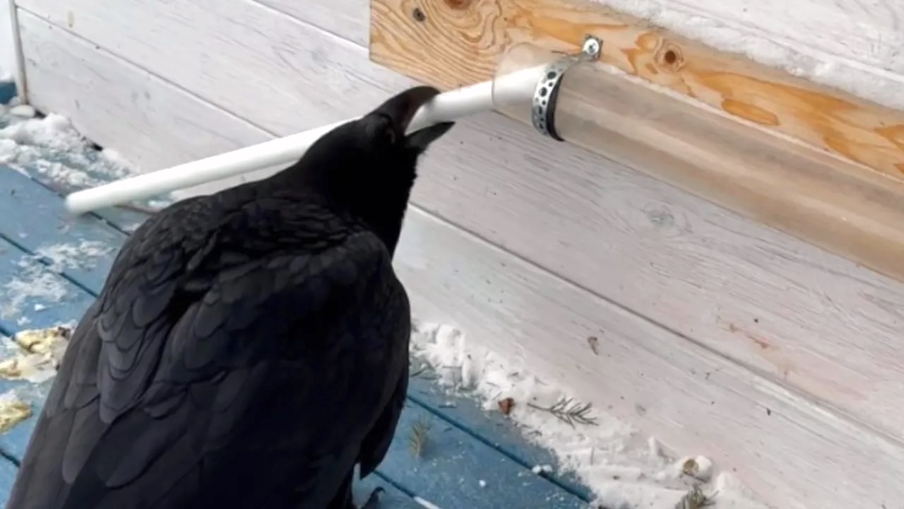 A very intelligent raven named Gosha quite cleverly used a stick to retrieve an elusive treat that his human stuck deep inside a tube.